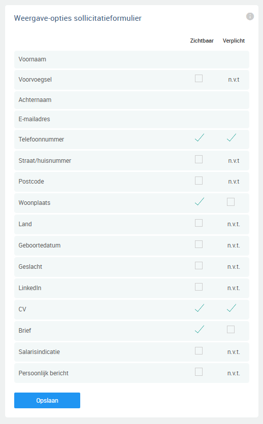 De overige invulvelden zijn optioneel om toe te voegen aan het sollicitatieformulier (zie onderstaande afbeelding). Vink aan welke velden je enkel zichtbaar wil maken voor de kandidaat om in te vullen en welke velden je verplicht voor een kandidaat om in te vullen om te kunnen solliciteren.