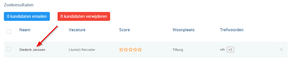 Zoek een kandidaat op via de database en klik het profiel open door op de naam te klikken. Dit kan natuurlijk ook direct vanuit een vacature.