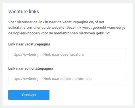 Om er toch voor te zorgen dat je de juiste links kunt gebruiken in bijvoorbeeld het kader Mediabronnen, kun je gebruikmaken van het veld “Vacature links”.